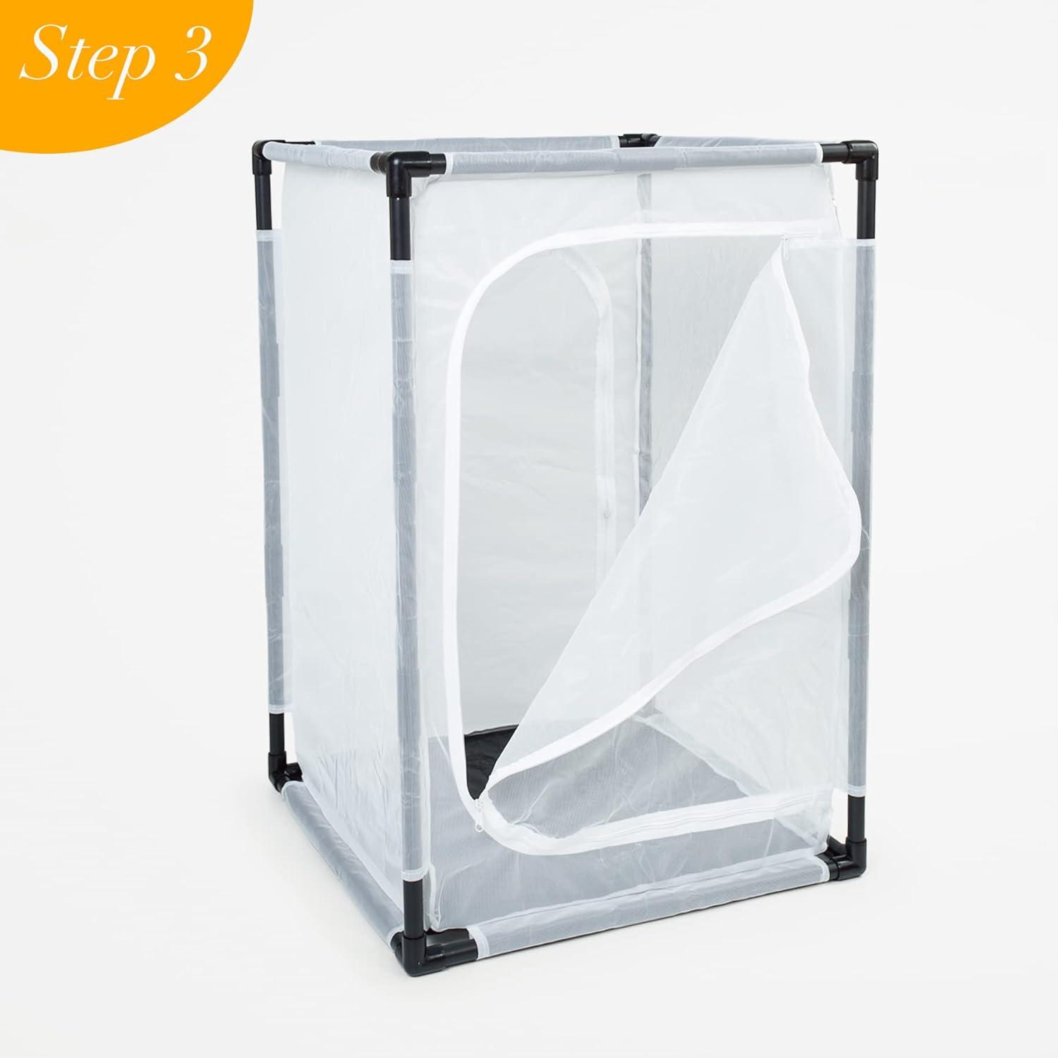 Caterpillar habitat consists of a durable PVC frame which is quickly assembled using the included pole connectors. A mesh tent fits onto this frame to create an enclosed cage, suitable for the rearing and maintenance of caterpillars. Please refer to manual or listing gallery picture for installation, the key is to use a hammer to connect the pole connect tightly.